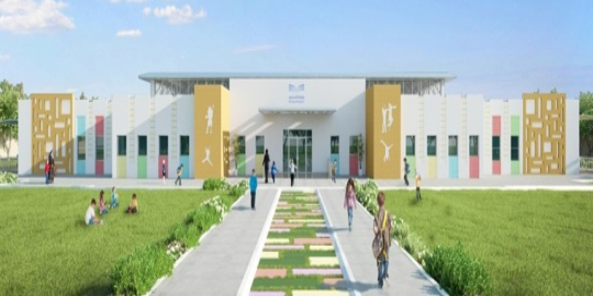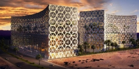The exterior façade developed from a geometric composition of mosaics traditionally found in Arabic architecture.  At the heart of the complex, the inner square connecting the buildings is protected by a cover of glass patchwork whose form and colour reflect that of a Bedouin tent commonly found in the desert.